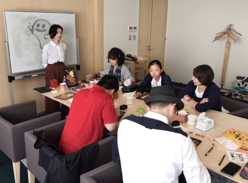 生徒さんが持って来て下さったハロウィンのイラスト見本を参考にしながら、それぞれお好きな顔に描いてゆきます。